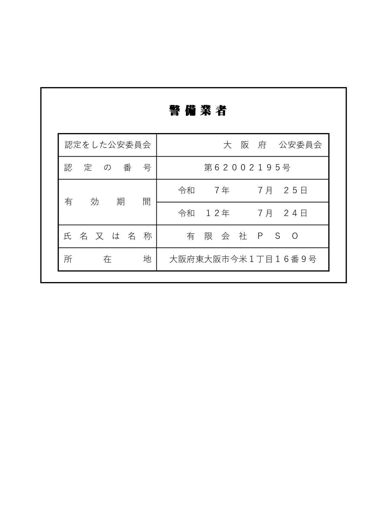 有限会社PSO(ピーエスオー)は、大阪府東大阪市に拠点を構える警備会社です。交通誘導警備をはじめ、施設内の巡回警備や、祭り・コンサートなどのイベント警備など、幅広い警備業務に対応しております。私たちは、隊員一人ひとりに対する教育と指導を徹底し、サービス品質と技術力の向上に努めることで、皆様に安心・安全を提供いたします。警備に関することなら、ぜひ有限会社PSO(ピーエスオー)にお任せください。